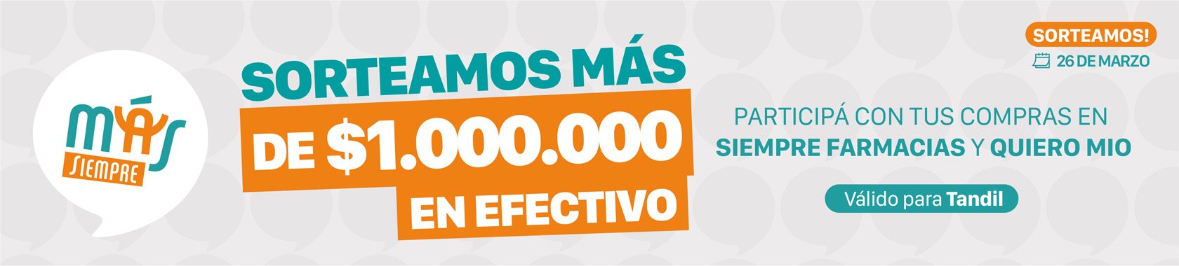 FCIA. DEL CENTRO DE LA SIERRA (Siempre Farmacias) intenta ser lo más preciso posible en sus descripciones de productos. Sin embargo, es posible que las descripciones de los productos u otros contenidos de este sitio no sean exactas o contengan errores. Sin perjuicio de lo dispuesto en el Art. 34 de la Ley 24.240, en caso de existencia de error entre la imagen publicitada de un producto y el producto adquirido, el cliente tendrá derecho a cancelar el pedido hasta 72 horas hábiles corridas desde que hubiere sido entregado sin recibir observación alguna por parte del cliente. En caso de cancelación del pedido una vez recibido el producto el cliente fundándose en inexactitudes en la descripción o imágenes del producto, este deberá reintegrar el mismo en perfecto estado, conjuntamente con todo su empaque original y todos sus accesorios. La información sobre características de los productos, a la que se accede a través de este sitio se obtiene de afirmaciones hechas por el fabricante de cada producto. Por favor tenga en cuenta que, en ocasiones los fabricantes pueden alterar sus empaques y etiquetas, de manera que el verdadero embalaje del producto y materiales adjuntos pueden contener información diferente de la que se muestra en el sitio. FCIA. DEL CENTRO DE LA SIERRA (Siempre Farmacias) recomienda especialmente que adicionalmente a la información presentada en línea lea las etiquetas, advertencias e instrucciones antes de adquirir, utilizar o en cualquier forma consumir un producto. Para obtener información adicional acerca de un producto, por favor póngase en contacto con nosotros a info@siemprefarmacias.com.ar