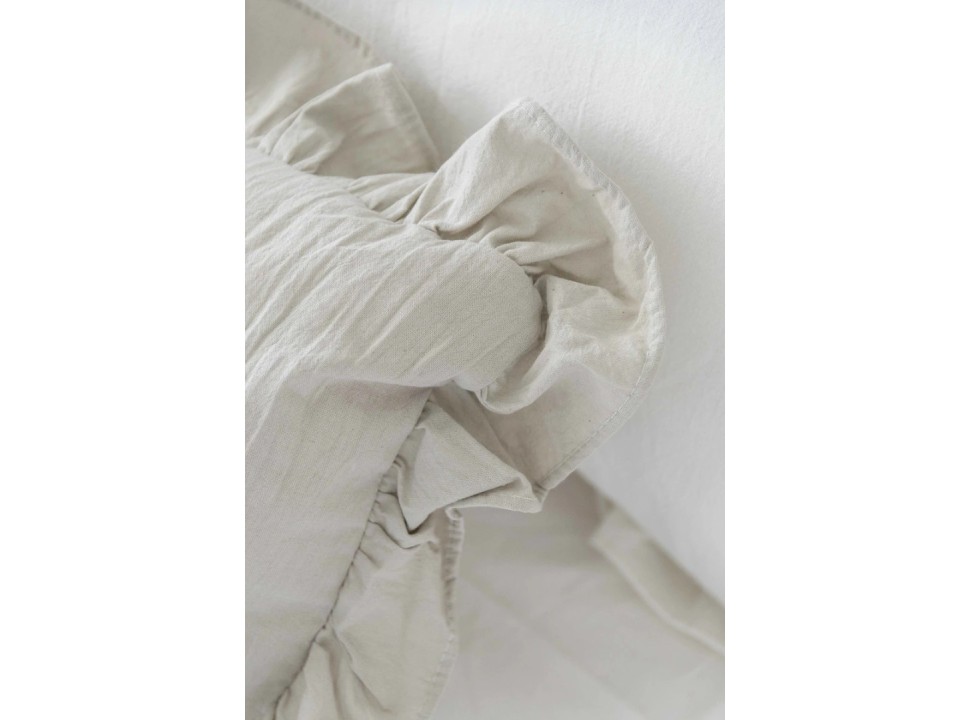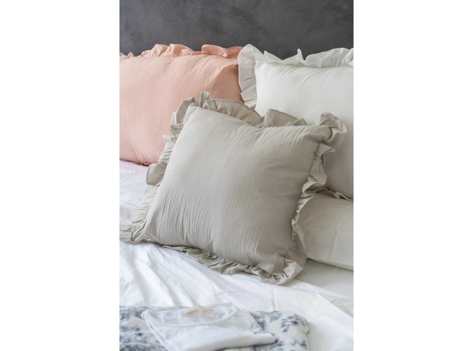 Almohadón liso en tusor, medida 50x50 cm, con detalle en volados de la misma tela. Funda desmontable para su lavado. Incluye relleno de vellón siliconado. Color: Tostado y gris
