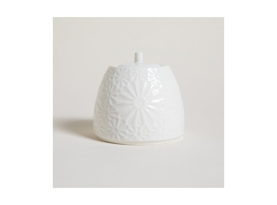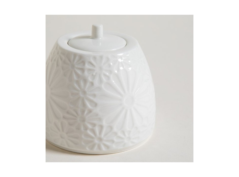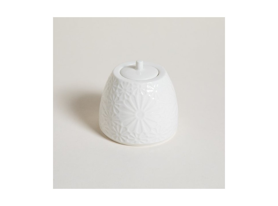 Azucarera con tapa fabricada en cerámica de color blanco. Diseño delicado con textura. Material resistente y duradero.