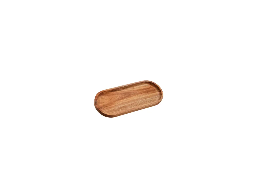 Bandeja ovalada fabricada en madera símil acaccia, con un acabado natural que aporta calidez y sofisticación a cualquier ambiente. Su tamaño compacto la hace perfecta para organizar jabones, perfumes, accesorios o pequeños objetos decorativos.