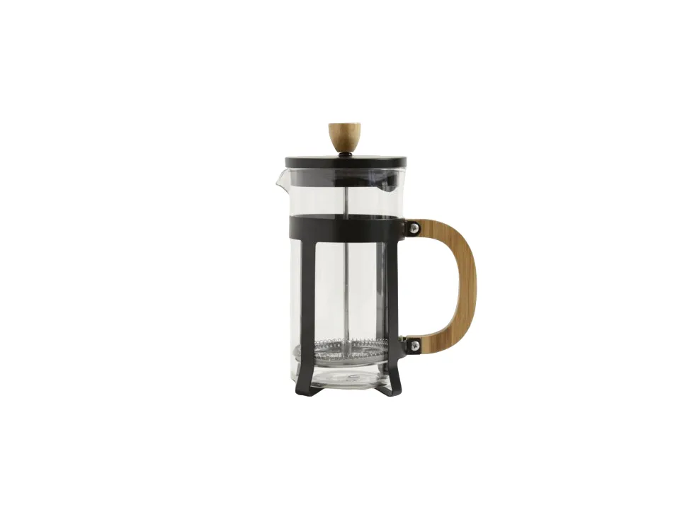 Cafetera de vidrio de 1 litro con estructura de acero y tapa de bamboo. Esta cafetera es ideal para elaborar café de forma rápida y sencilla.