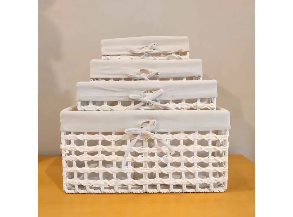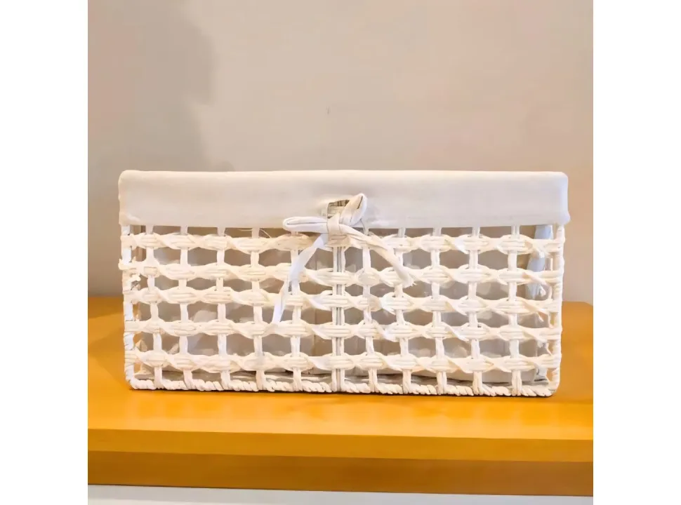 Este canasto forrado es perfecto para almacenar con estilo. Su diseño tejido en blanco, junto con un forro de tela y un delicado lazo, lo convierten en una pieza decorativa ideal para cualquier ambiente, mientras mantiene el orden y la organización.