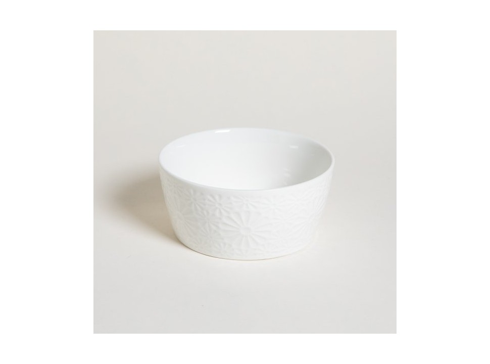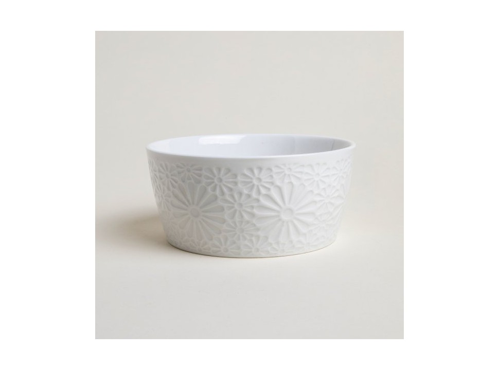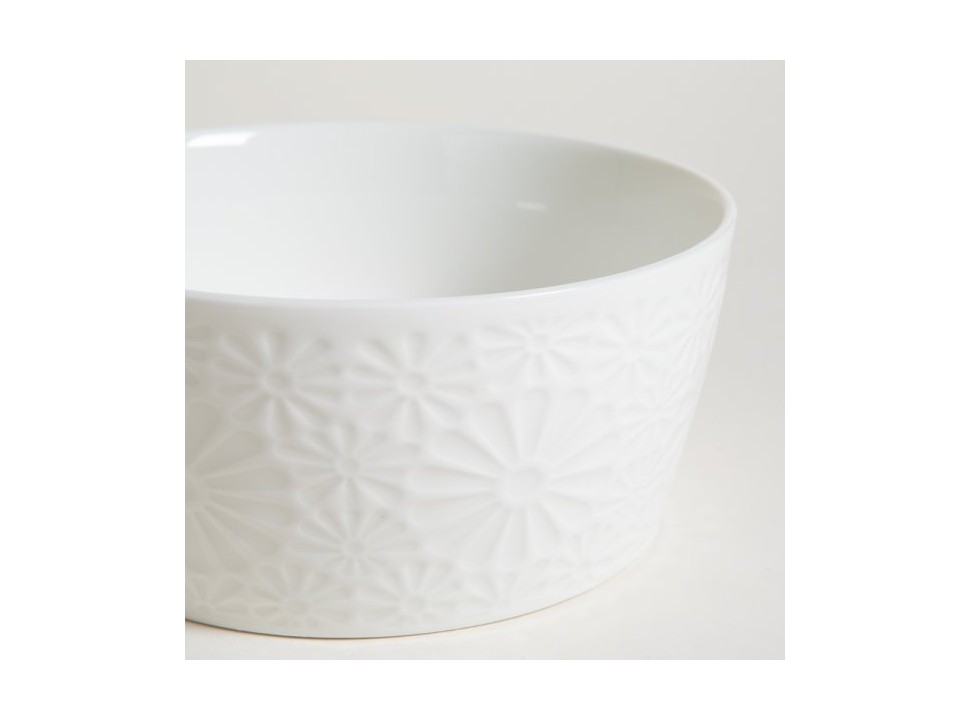 Ensaladera redonda fabricada en cerámica de color blanco. Diseño delicado con textura. Ideal para complementar con cubiertos dorados.