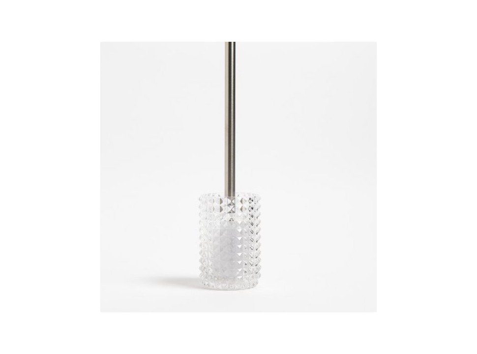 El vidrio transparente no solo es atractivo visualmente, sino que también es fácil de limpiar y mantener. Los detalles plateados en forma de rombos añaden un toque distintivo y decorativo, convirtiendo este escobillero en un elemento llamativo en tu baño.