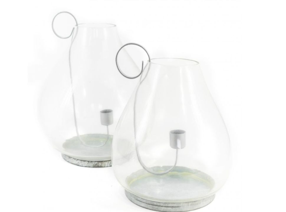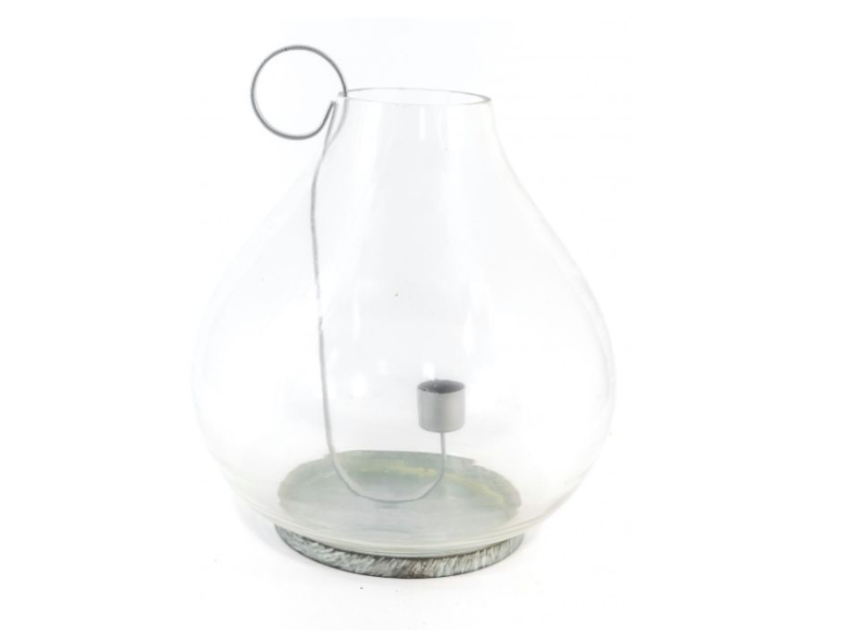 Fanal de vidrio transparente con base y portavela de metal.