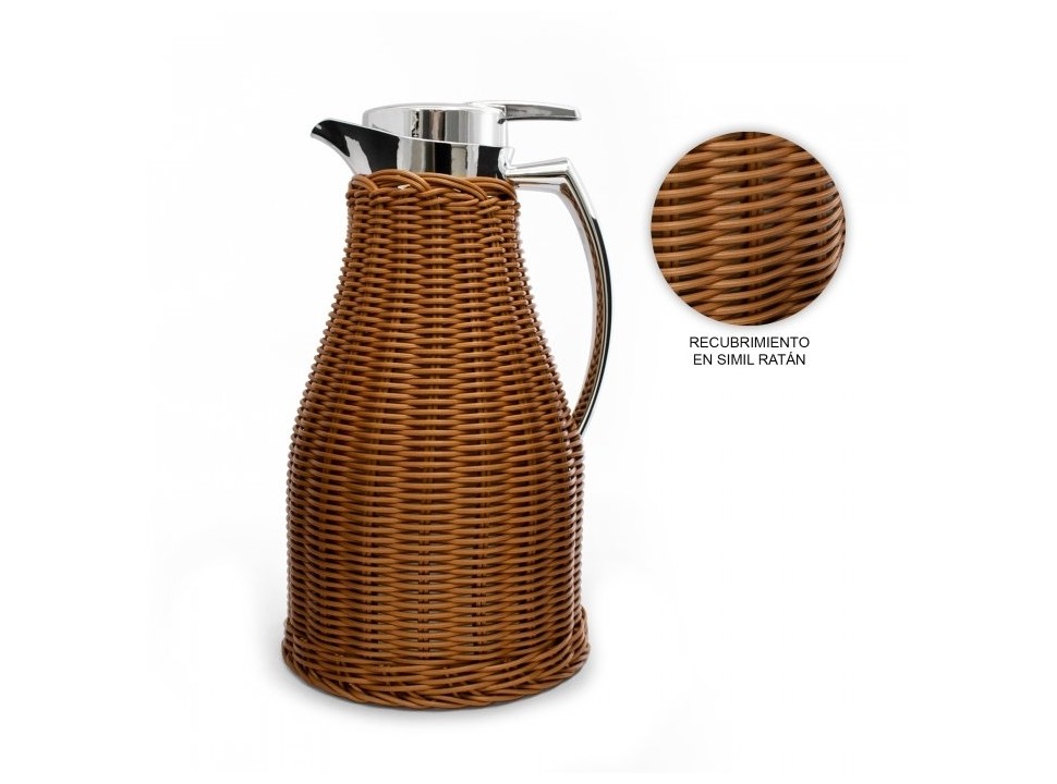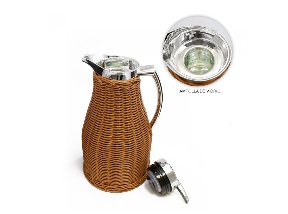 Jarra térmica modelo sakura ratan, con capacidad de 1 litro, realizada en acero inoxidable, con tulipa de vidrio en su interior, la cual mantiene hasta 12 horas de agua caliente o 24 horas de agua fría. Su sistema vertedor te permite servir con una sola mano.