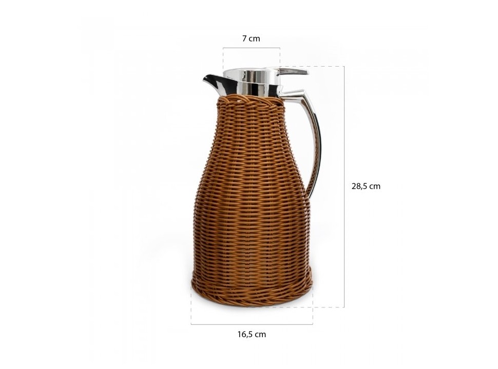 Jarra térmica modelo sakura ratan, con capacidad de 1 litro, realizada en acero inoxidable, con tulipa de vidrio en su interior, la cual mantiene hasta 12 horas de agua caliente o 24 horas de agua fría. Su sistema vertedor te permite servir con una sola mano. MEDIDAS: Altura: 25 cm. Ancho: 18 cm.