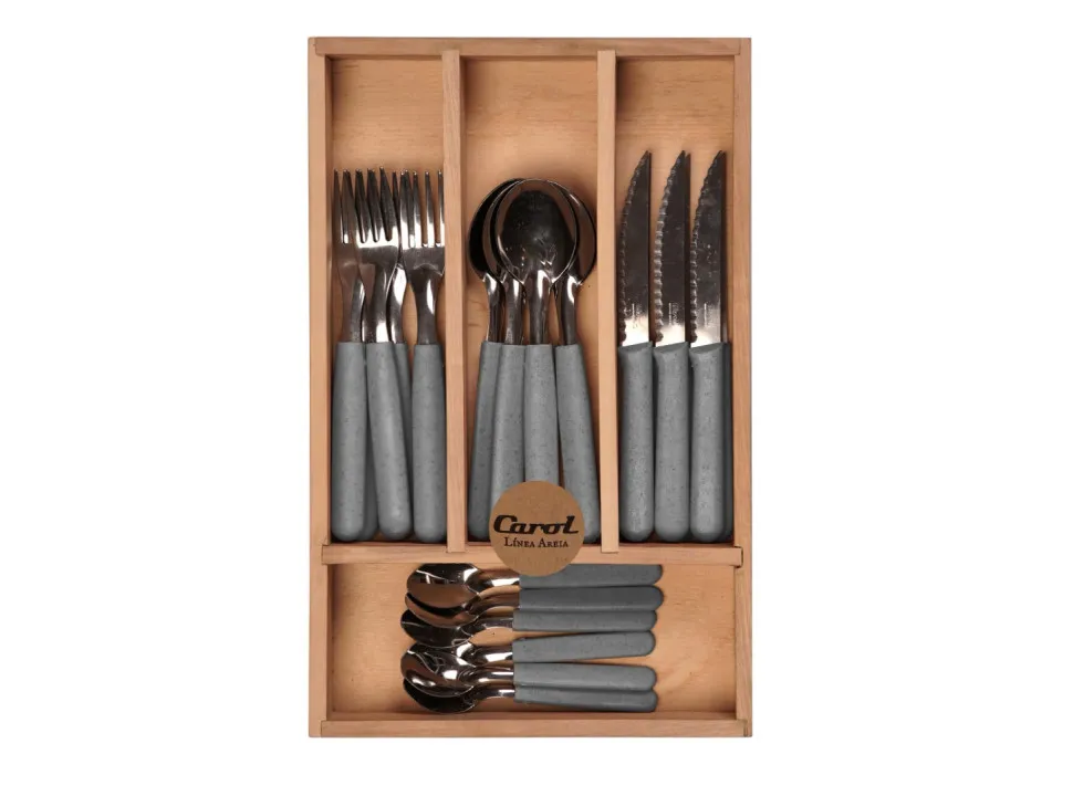 Juego de cubiertos de 24 piezas de acero inoxidable y mango de plástico.