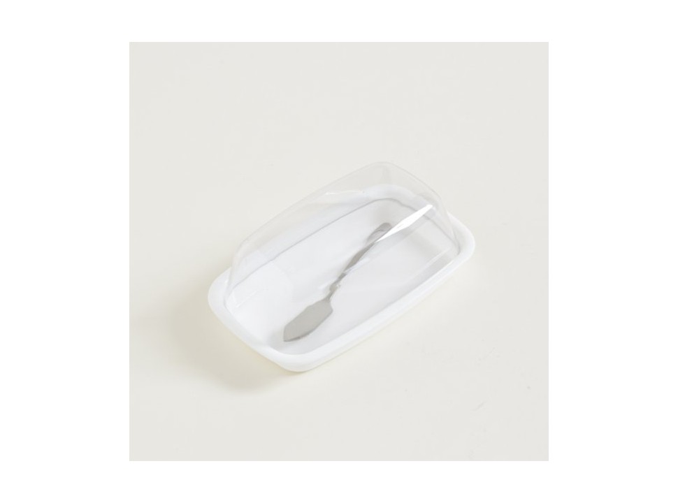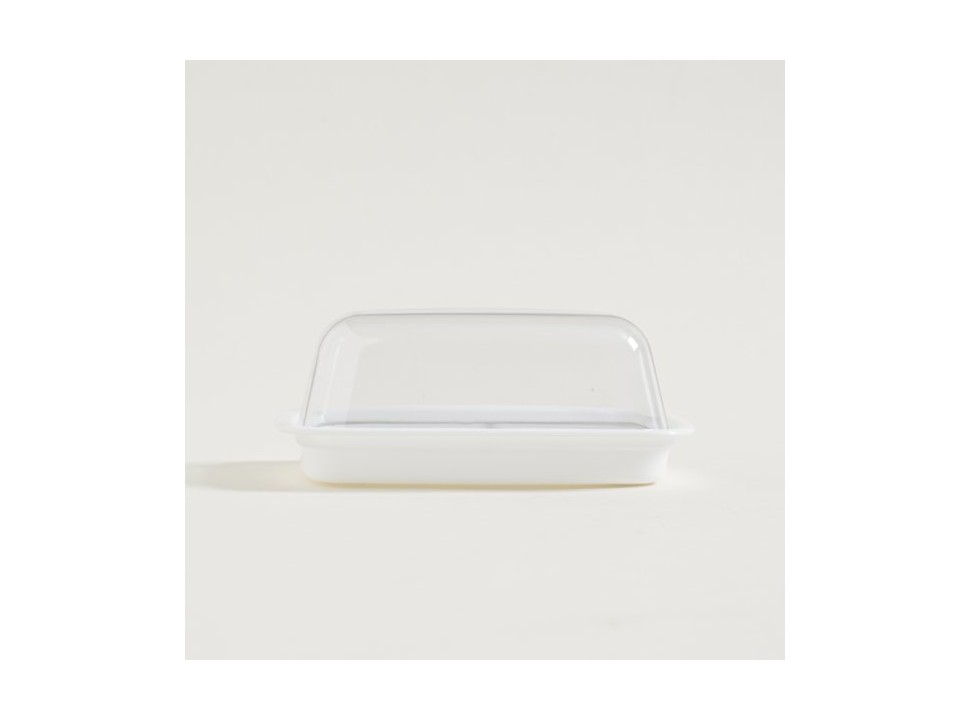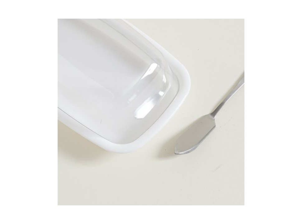 Mantequera de color blanco en su base y tapa de acrílico transparente.