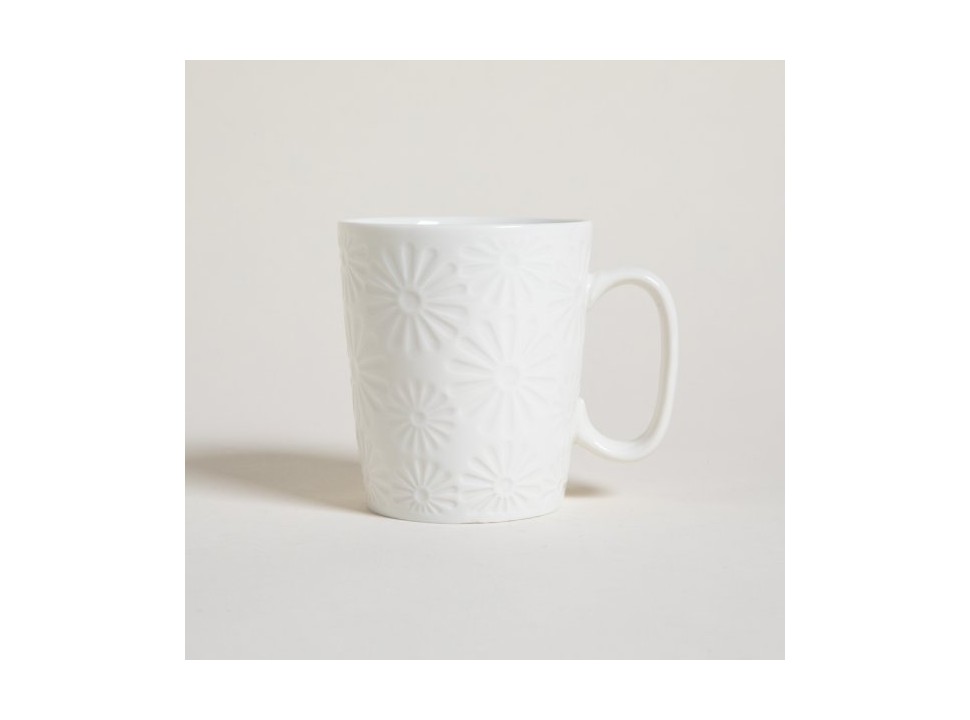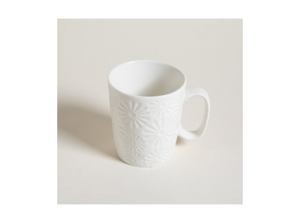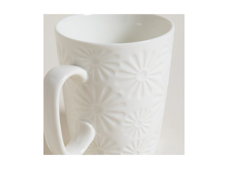 Mug con asa fabricado en cerámica de color blanco. Diseño delicado con textura. Ideal para complementar con cucharas doradas.