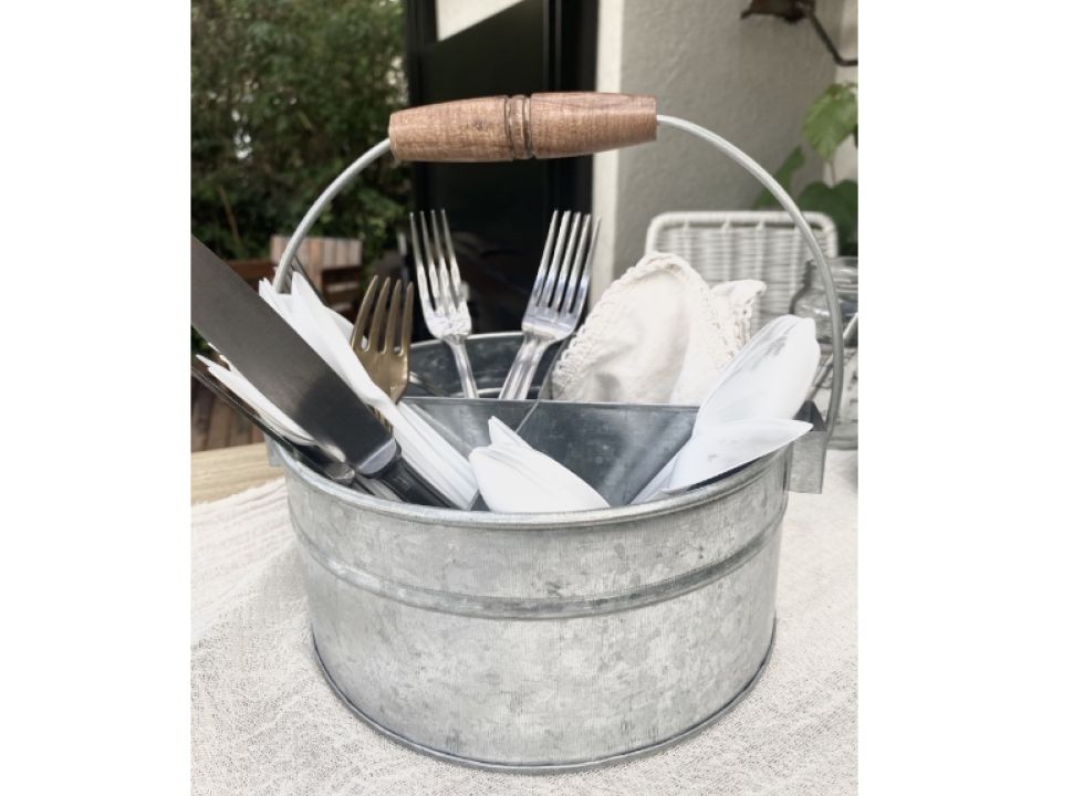 Organizador de zinc con 4 divisiones con manija de alambre con madera. Medidas: altura 10 cm x diametro 21 cm.