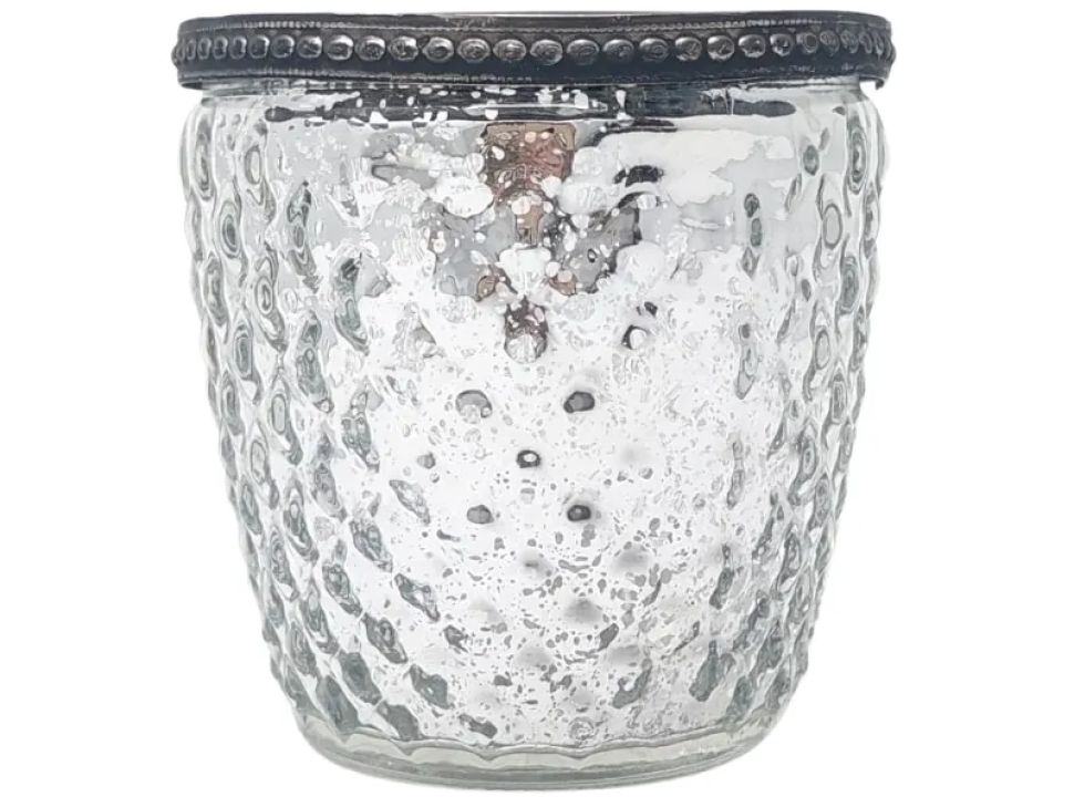 Portavela de vidrio con diseño en metal. Para velitas de noche.