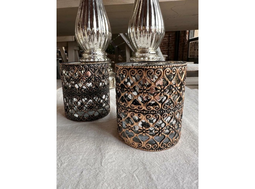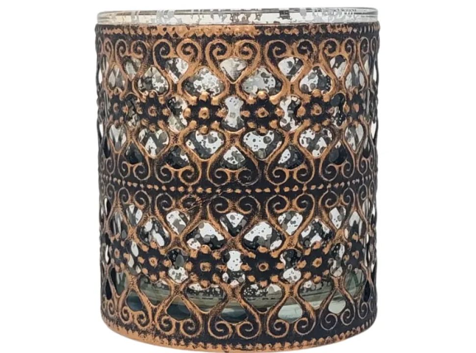 Portavela de 7.5 x 7.5 x 8 de vidrio con recubierta en metal calado color dorado gastado. Para velas de noche.