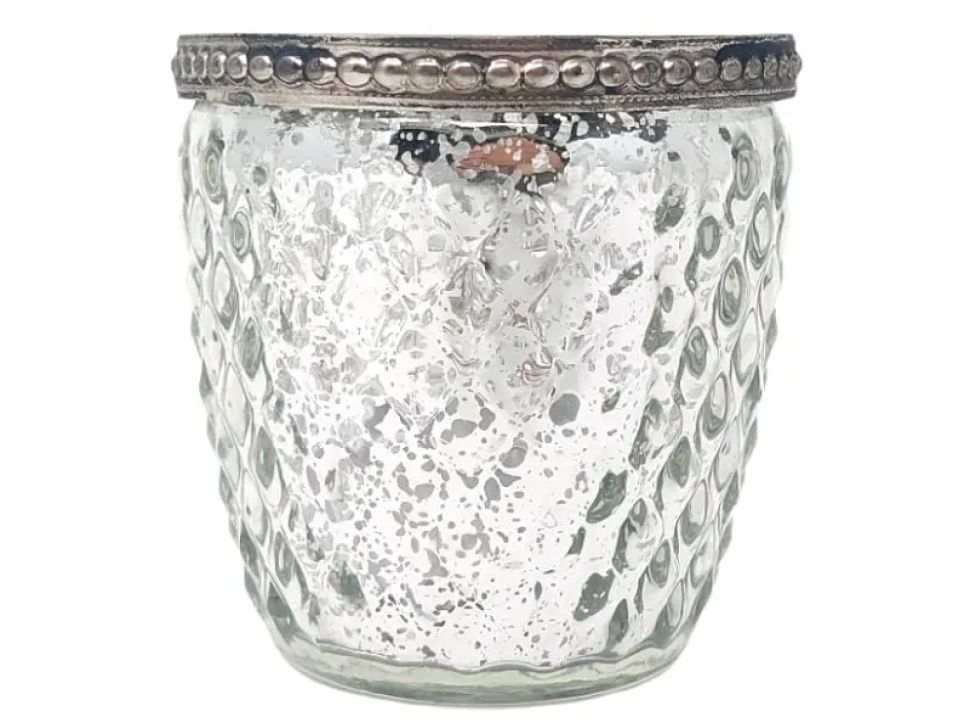 Portavela de vidrio con diseño en metal. Para velitas de noche.