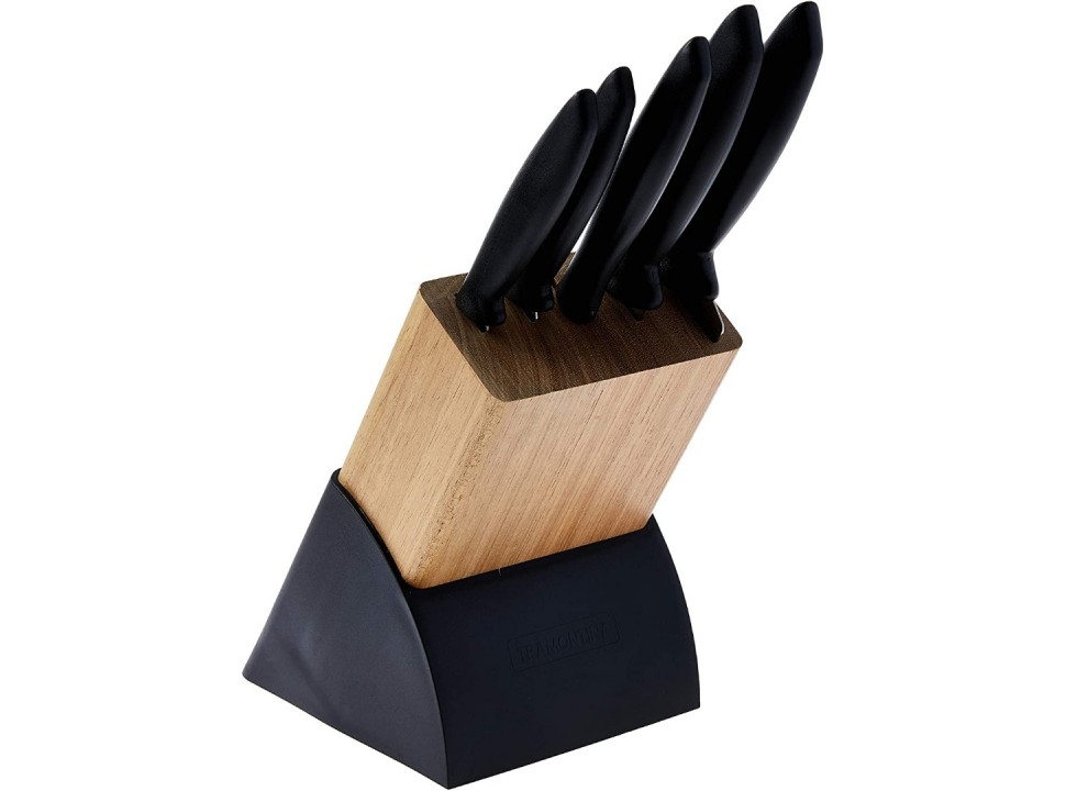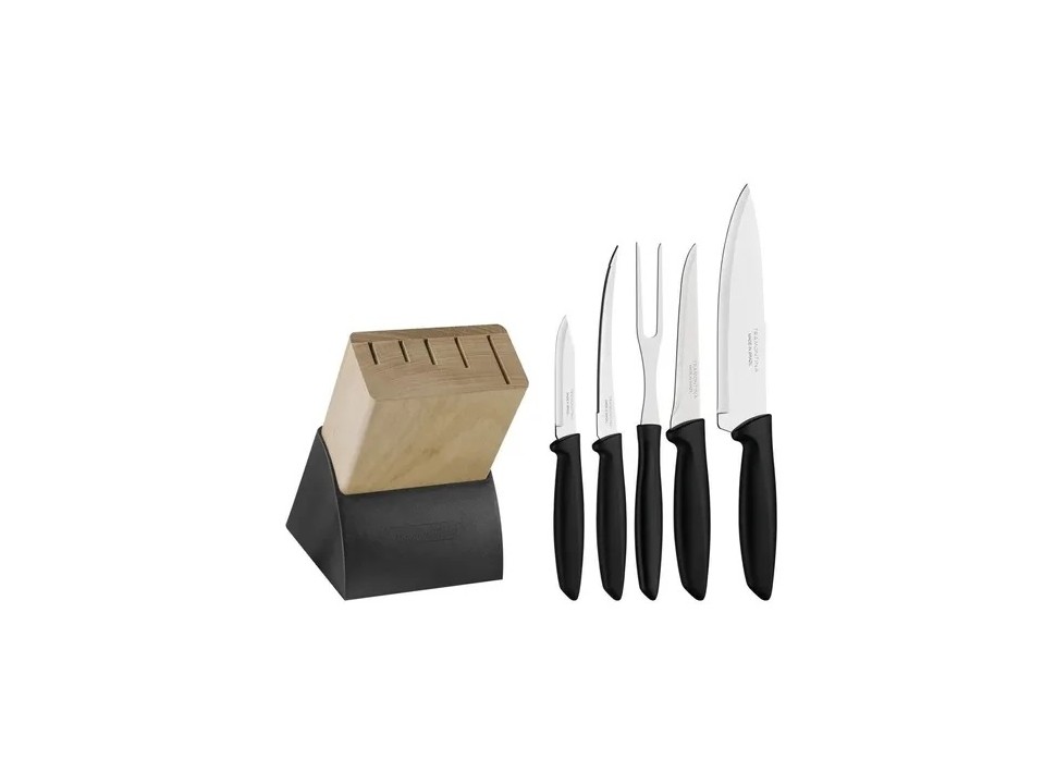 JUEGO DE CUCHILLOS TRAMONTINA EN TACO DE MADERA. CONTIENE: -CUCHILLO LEGUMBRES Y FRUTAS 3 PULGADAS - CUCHILLO TOMATE 5 PULGADAS - CUCHILLO DESHUESAR 5 PULGADAS - CUCHILLO CHEF 7 PULGADAS - TENEDOR TRINCHANTE