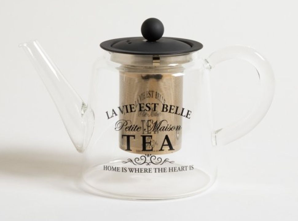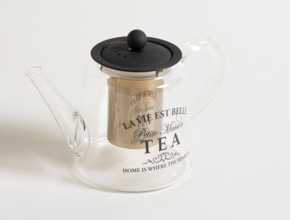 Tetera de vidrio Petit Maison con tapa color negro mate y filtro, el mismo se retira fácilmente para una mejor limpieza de producto.